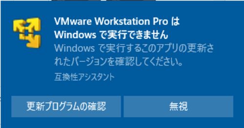 弊社のメイン口座のインターネットバンキングは色々な経緯があり、VM内のWindows 10で動作している。 口座を確認しようとVMを起動しようとしたらこのダイアログである。前日は起動できてたのに。 あと、Workstation ProじゃなくてWorkstation Playerなんです…