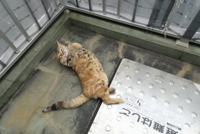 いつものコーナーに移動して伸び。風強いのでオレは家に入りたい。
